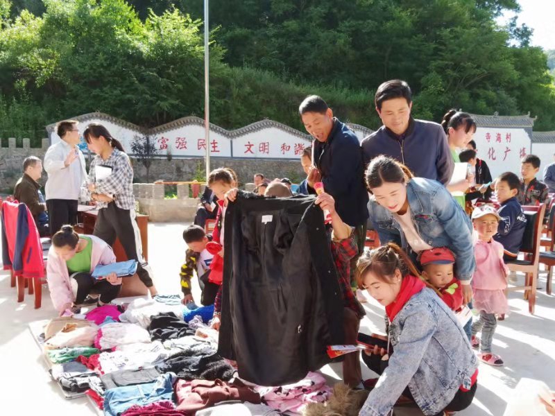 在推广电商扶贫环节结束后,小分队马不停蹄的开展了“兰博善诚”公益认领活动。这次公益认领由两个部分组成:小分队首先给到场的18名员工分发了文具和乒乓球拍,在分发的过程中向有意向报考公司的高考毕业生,讲解公司的优势专业,并向其讲述大学的学习和生活等,鼓励其报考公司。随后小分队先将带着满满爱意的衣服分类、筛选,放在事先准备好的毯子上,让村民在挑选衣物的时候更加方便。在衣物捐赠活动开始后,现场闻迅而来的村民络绎不绝,村民们挑选着适合自己的衣服。在活动的现场,志愿者们帮助居民挑选、试穿衣物,朴实的村民在领到衣物后都露出了开心的笑容。