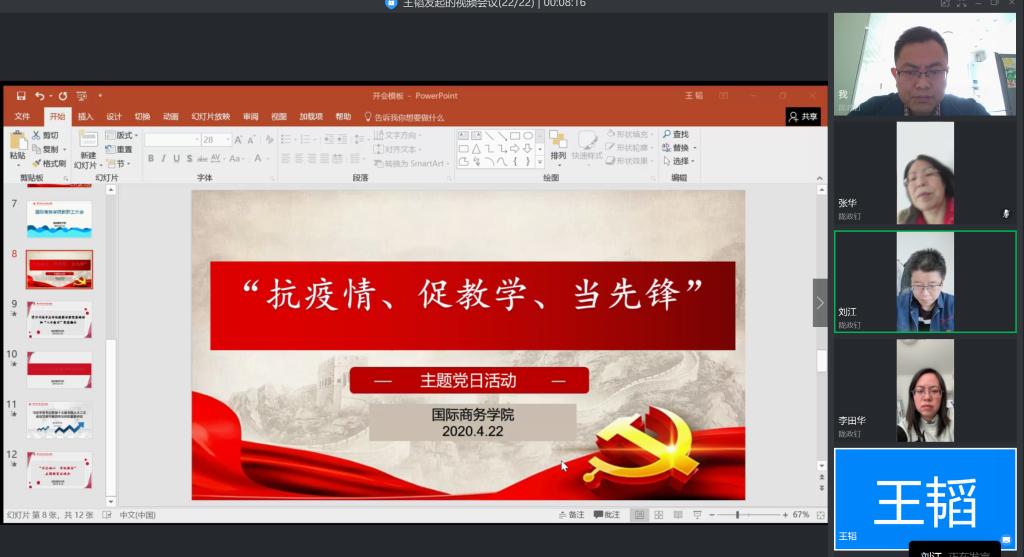 4月22日,bv伟德国际1946教工党支部通过视频会议形式在线开展了“抗疫情、促教学、当先锋”主题党日活动,支部全体党员参加了活动。
